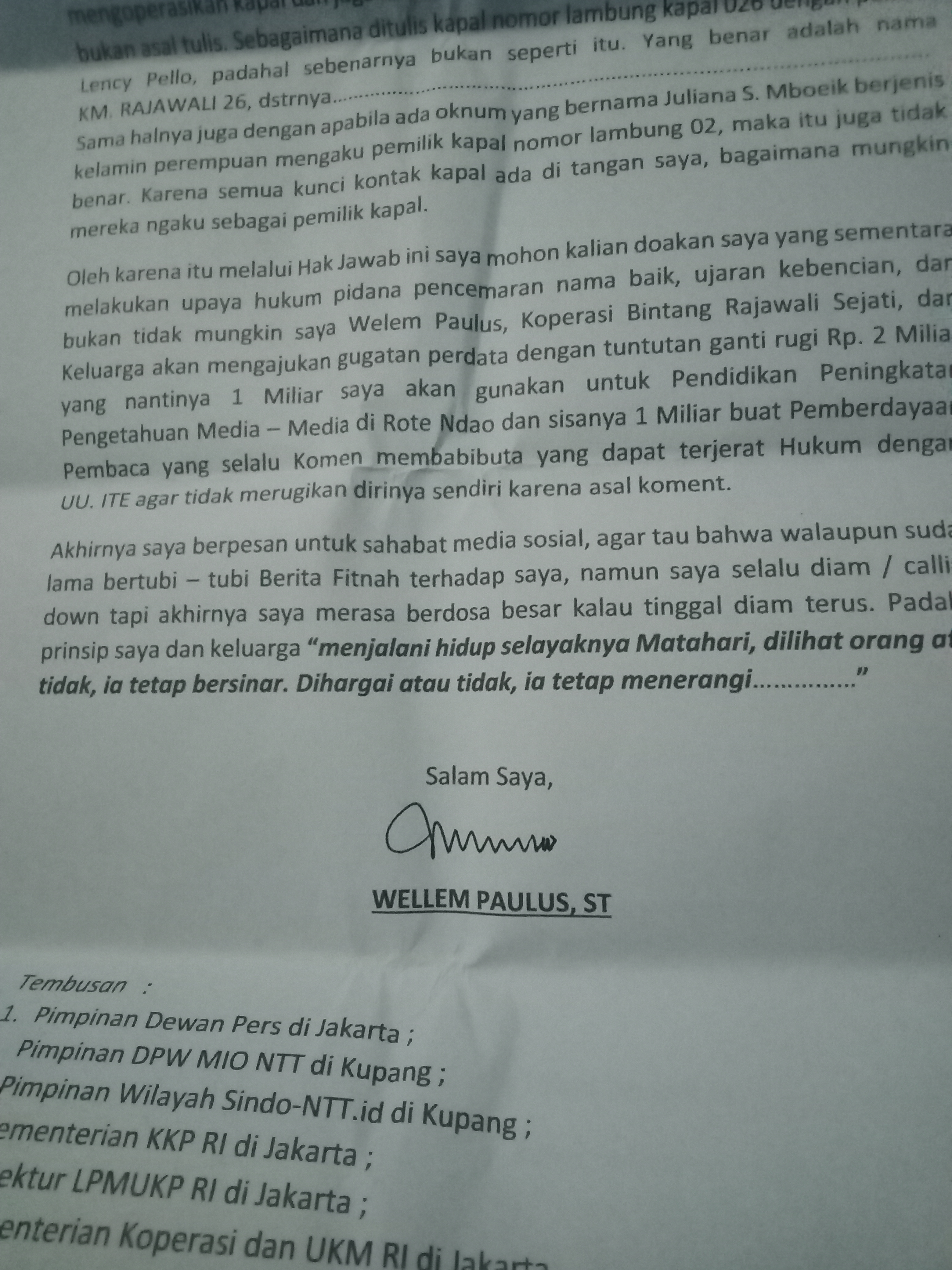 Oleh karena itu melalui Hak Jawab ini saya mohon kalian doakan saya yang sementara melakukan upaya hukum pidana pencemaran nama baik, ujaran kebencian, dan bukan tidak mungkin saya Welem Paulus, Koperasi Bintang Rajawali Sejati, dan Keluarga akan mengajukan gugatan perdata dengan tuntutan ganti rugi Rp. 2 Miliar yang nantinya 1 Miliar saya akan gunakan untuk Pendidikan Peningkatan Pengetahuan Media – Media di Rote Ndao dan sisanya 1 Miliar buat Pemberdayaan Pembaca yang selalu Komen membabibuta yang dapat terjerat Hukum dengan UU. ITE agar tidak merugikan dirinya sendiri karena asal koment.