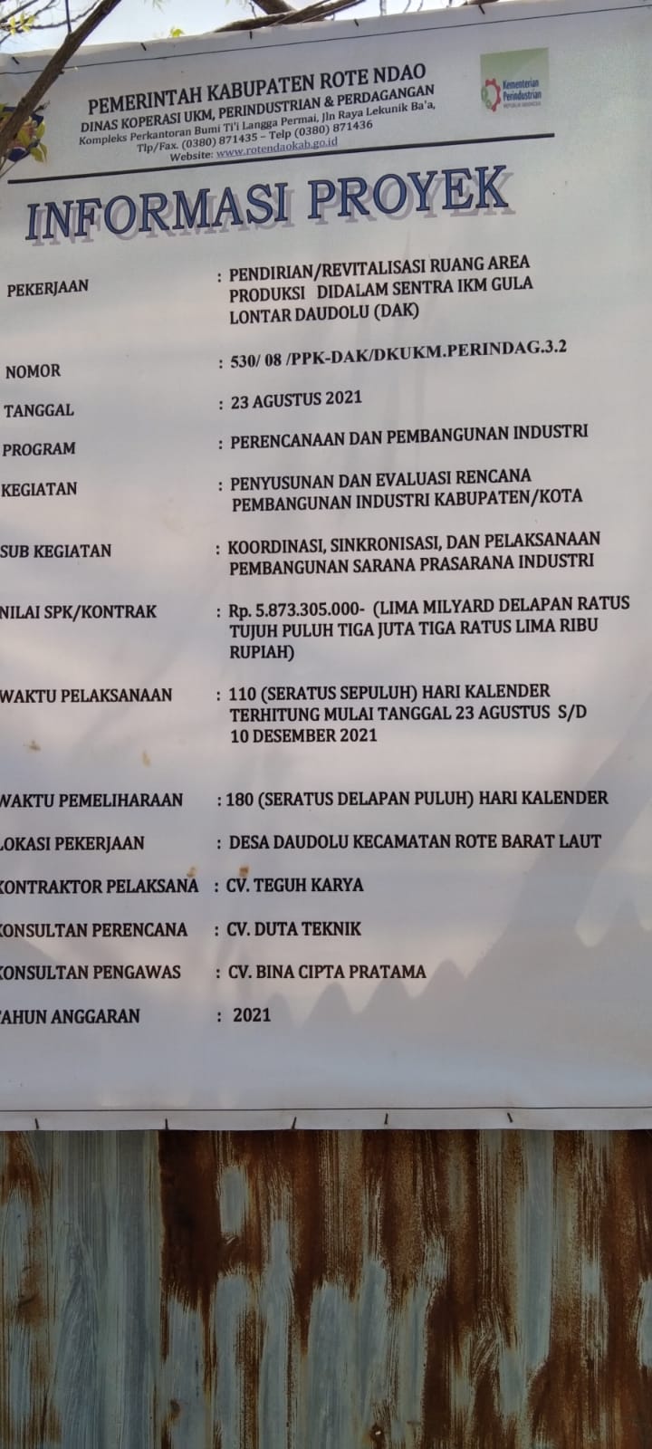 Pelaksanaan Pembangunan, Pendirian/Revitalisasi Ruang Area Produksi Didalam Sentra IKM Gula Lontar Daudolu (DAK) melalui Dinas Koperasi UKM, Perindustrian dan Perdagangan Kabupaten Rote Ndao, Program perencanaan dan pembangunan industri, Kegiatan penyusunan dan evaluasi rencana pembangunan industri kabupaten/kota, dengan Nilai SPK/Kontrak Rp.5.873.305.000,- dengan waktu Pelaksanaan 110 hari kalender terhitung mulai tanggal 23 Agustus sampai dengan 10 Desember 2021, yang telah melewati masa akhir kontrak dan melampaui tahun anggaran namun kontraktor pelaksana masih mengerjakan proyek tersebut,