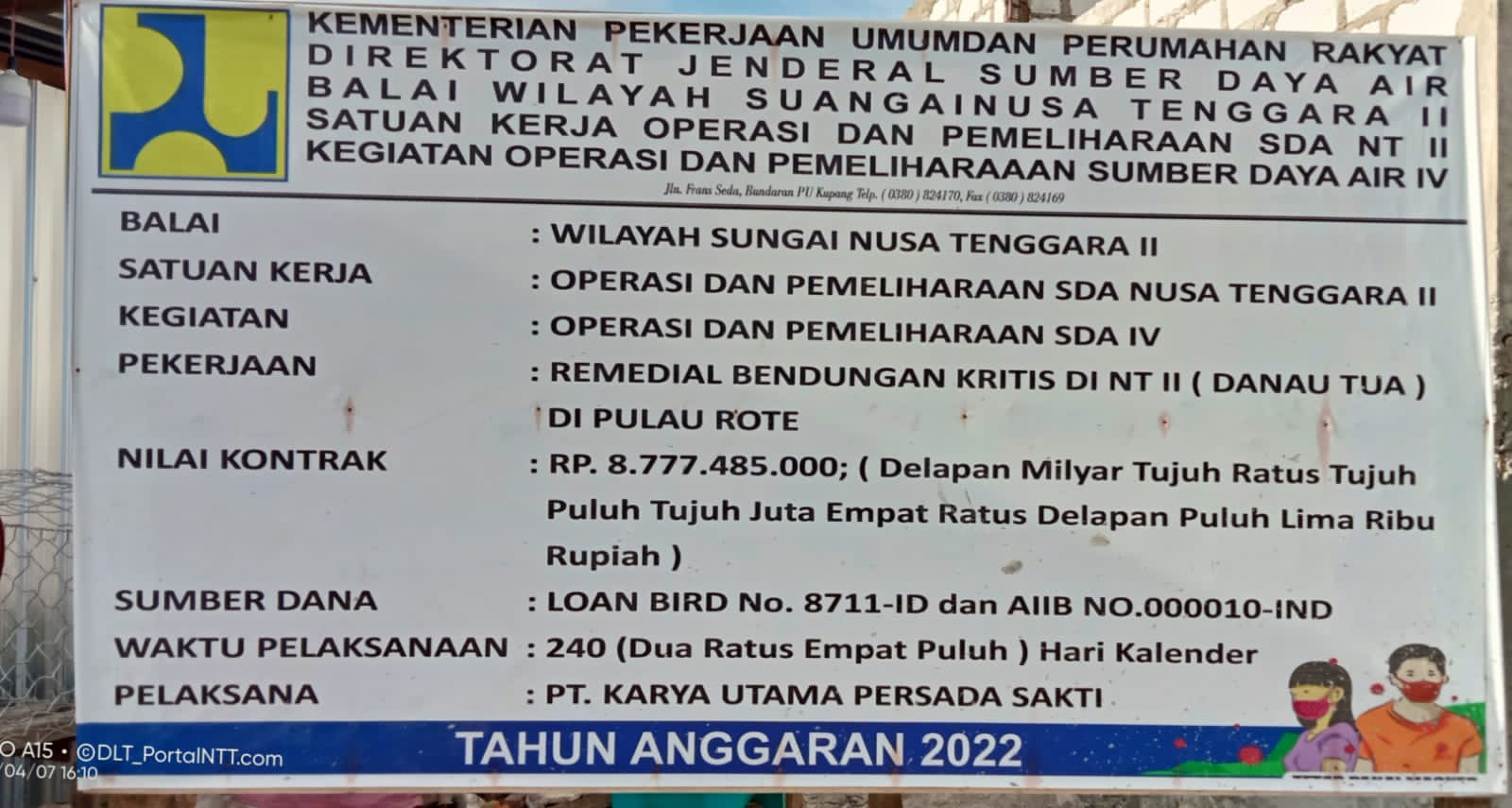 Untuk diketahui bahwa Proyek Remedial Bendungan Danau Tua ini mulai dikerjakan oleh PT. Karya Utama Persada Sakti sejak akhir bulan Januari Tahun 2022 dalam durasi waktu selama 240 hari kalender dengan anggaran sebesar Rp. 8.777.485.000 yang bersumber dari Kementerian Pekerjaan Umum dan Perumahan Rakyat, Balai Wilayah Sungai NTT.(Nasa)