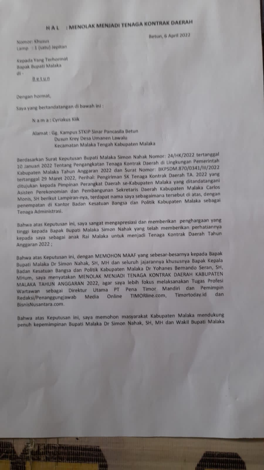 Di bagian lain suratnya, mantan wartawan Suara Timor Timur-Dili dan Pemimpin Redaksi Harian Suara Masyarakat-Kupang ini memohon maaf yang sebesar-besarnya kepada Bupati Simon dan seluruh jajarannya khususnya Kepala Badan Kesatuan Bangsa dan Politik Kabupaten Malaka Dr Yohanes Bernando Seran, SH, MHum atas pilihannya menyatakan menolak menjadi tenaga kontrak daerah Kabupaten Malaka TA 2022.
