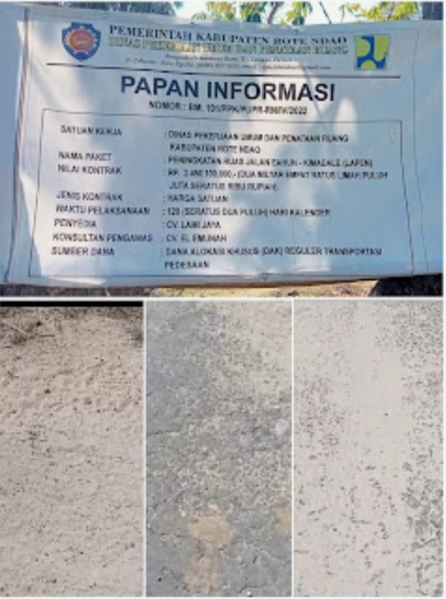 Dikarekan, proyek yang merupakan bagian dari pekerjaan peningkatan ruas jalan Kimadale – Eahun Kecamatan Rote Timur dengan pagu anggaran Rp 2.450.100.000 di beberapa titik sudah rusak parah, padahal baru selesai dikerjakan oleh Kontraktor Sonny Wempi Henukh