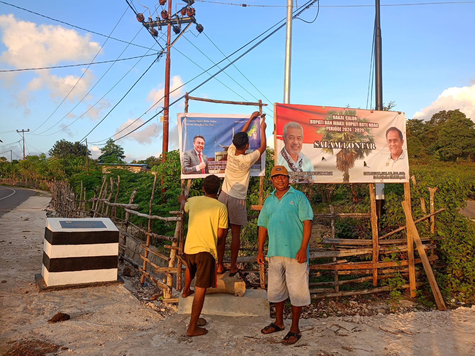 Terpantau Hari ini minggu, (28/04/2024) di Pertigaan Kapasiok Desa Lidabesi, Kecamatan Rote Tengah, beberapa warga antusias dan iklas memasang Baliho Paulus Henuk