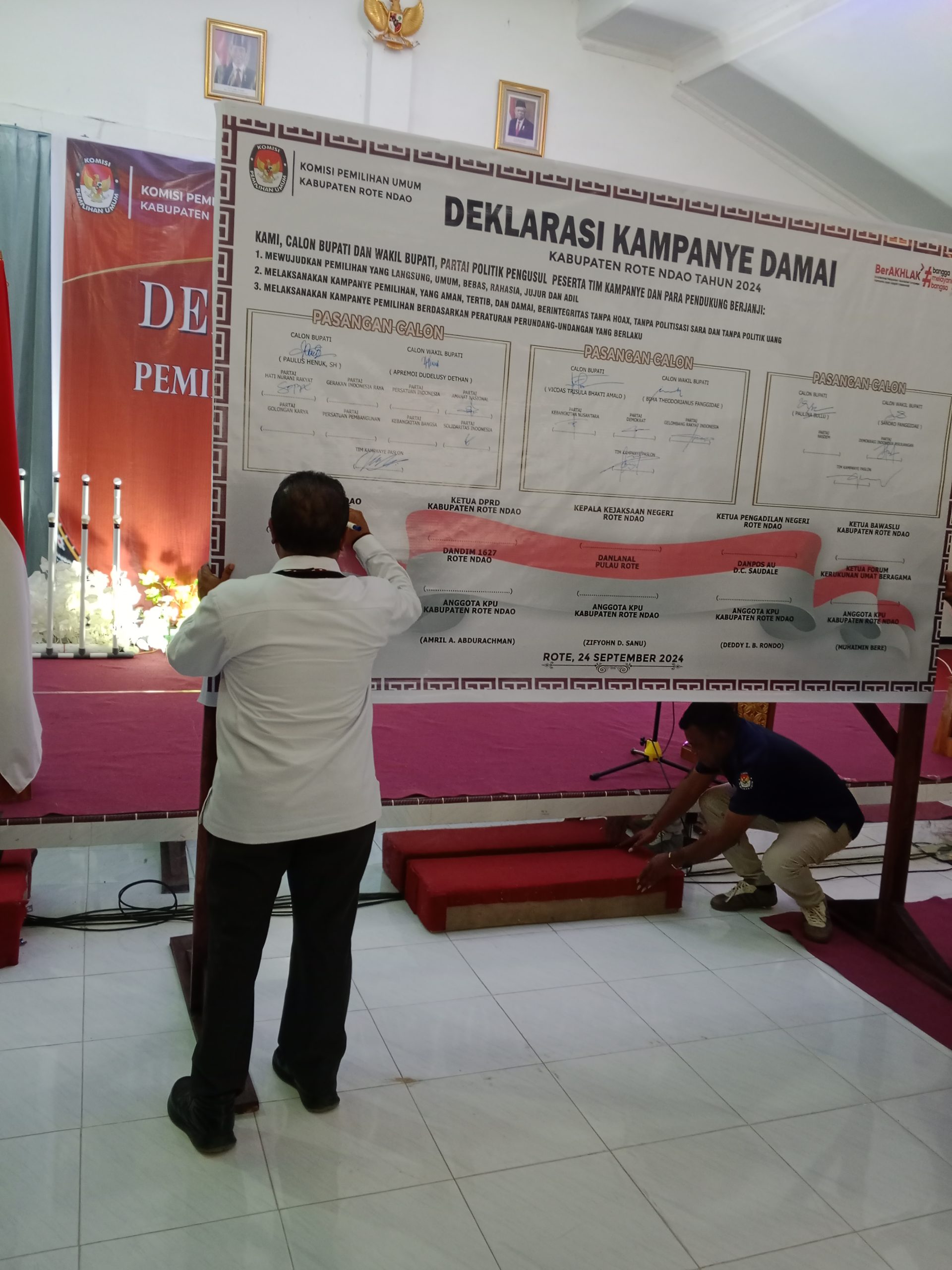 Seusai Rapat Pleno Terbuka Pengundian dan Penetapan Nomor Urut untuk tiga Pasangan Calon (Paslon) Bupati/Wakil Bupati Rote Ndao 2024, KPU Rote Ndao kembali menghadirkan tiga pasangan Calon Kepala Daerah pada acara Deklarasi Kampanye Damai