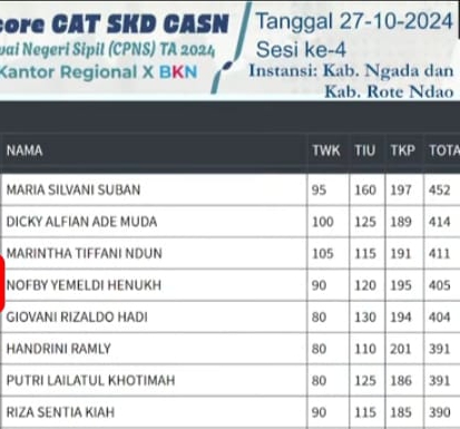 “Untuk sementara nilai tertinggi atas nama Maria Silvani Suban, total nilai 452,” Ujar Kepala Badan Kepegawaian Daerah Rote Ndao Meilon Bernad Sulla, S.H kepada wartawan, Jumat (01/11/2024)