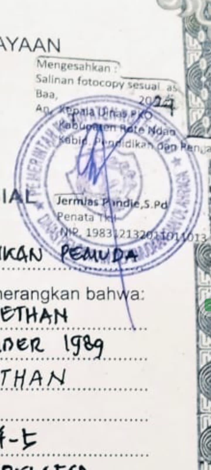 Kepala Dinas Pendidikan, Kepemudaan dan Olahraga (Kadis PKO) Kabupaten Rote Ndao saat ini Yosep Pandie, S.Pd mengakui dan mengesahkan Ijasah Paket C milik Wakil Bupati Rote Ndao terpilih 2024 Apremoi Dudelusy Dethan itu asli dan Sah untuk digunakan sebagai administrasi Calon wakil Bupati 2024-2029 pada saat verifikasi administrasi Calon di Komisi Pemilihan Umum