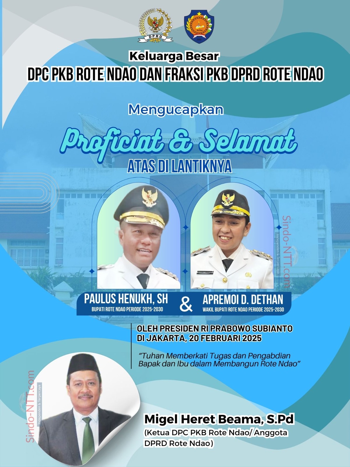 Dewan Pimpinan Cabang Partai Kebangkitan Bangsa (DPC PKB) Kabupaten Rote Ndao mengucapkan Proficiat dan Selamat atas di Lantiknya Paulus Henuk, SH dan Apremoi Dudelusy Dethan Sebagai Bupati/Wakil Bupati Rote Rote Ndao periode 2025-2030 oleh Presiden Republik Indonesia Prabowo Subianto di Jakarta, Kamis, 20 Februari 2025