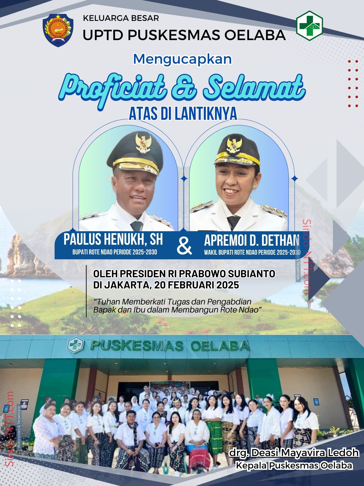 UPTD Puskesmas Oelaba Kecamatan Loaholu mengucapkan Proficiat dan Selamat atas di Lantiknya Paulus Henuk, SH dan Apremoi Dudelusy Dethan Sebagai Bupati/Wakil Bupati Rote Rote Ndao periode 2025-2030 oleh Presiden Republik Indonesia Prabowo Subianto di Jakarta, Kamis, 20 Februari 2025