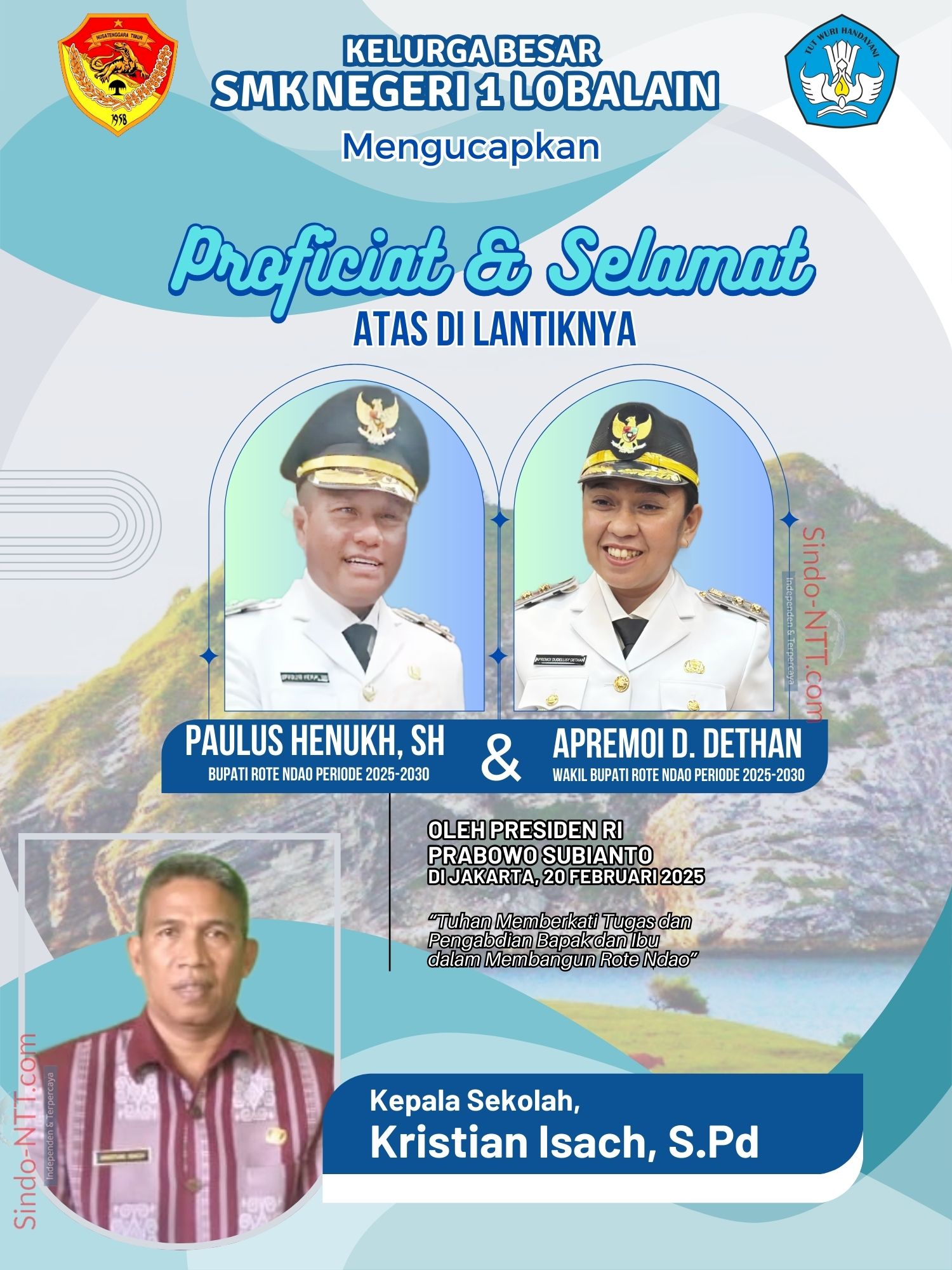 mengucapkan selamat kepada Paulus Henuk, Sh dan Apremoi Dudelusy Dethan atas pelantikannya sebagai Bupati dan Wakil Bupati Rote Ndao oleh Presiden Prabowo Subianto pada tanggal 20 Februari 2025 di istana Negara, jakarta