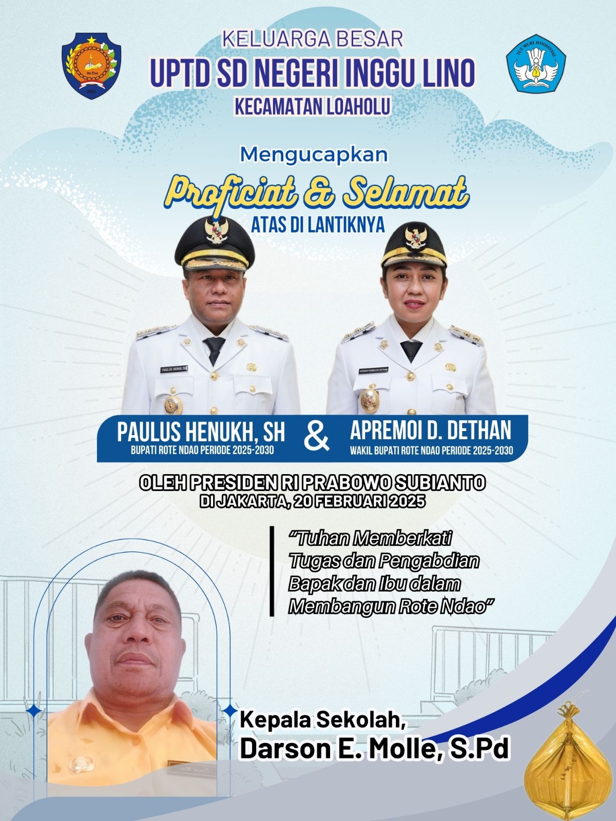Keluarga Besar UPTD SD Inggu Lino Desa Lidor Kecamatan Loaholu mengucapkan Proficiat dan Selamat atas di Lantiknya Paulus Henuk, SH dan Apremoi Dudelusy Dethan Sebagai Bupati/Wakil Bupati Rote Rote Ndao periode 2025-2030 oleh Presiden Republik Indonesia Prabowo Subianto di Jakarta, Kamis, 20 Februari 2025