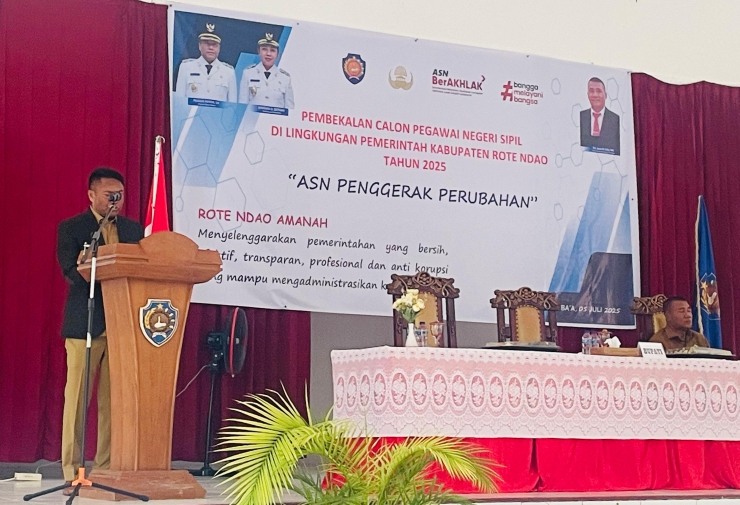 Untuk mewujudkan Agenda tersebut, Bupati Paulus Henuk menghadirkan 414 Calon Pegawai Negeri Sipil (CPNS) Formasi 2024 di lingkungan Pemerintah Kabupaten Rote Ndao pada acara pembekalan di Auditorium Tii Langga Kompleks Perkantoran, Sabtu (05/07/2025)