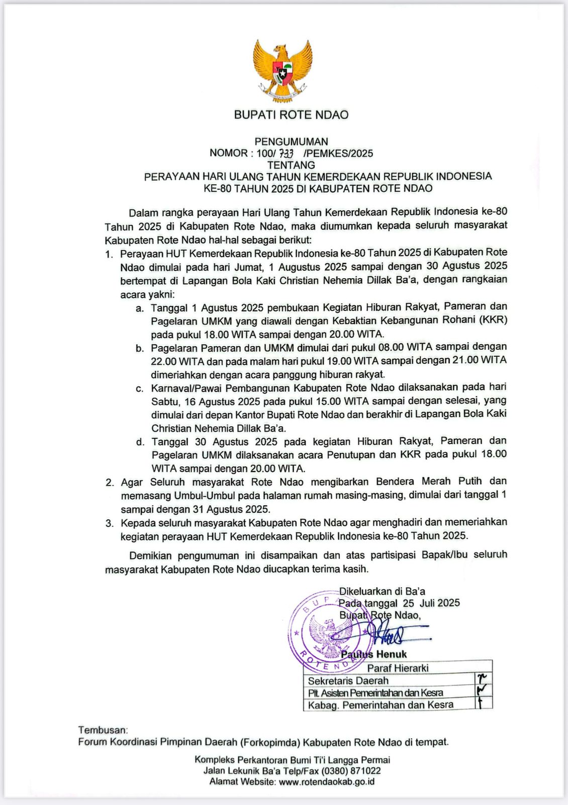 Pemkab Rote Ndao turut mengajak seluruh masyarakat untuk menyemarakkan perayaan ini dengan menghadiri seluruh kegiatan serta memasang Bendera Merah Putih dan Umbul-Umbul di lingkungan masing-masing sepanjang bulan Agustus (Tim/RN)