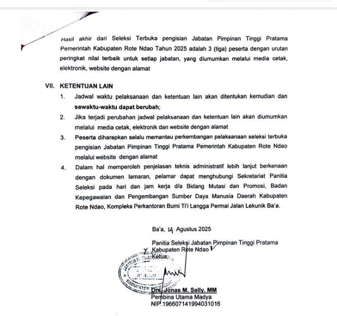Sekretaris Daerah Jonas Selly sebagai Ketua Panitia Seleksi mengakui kalau dirinya sudah mengeluarkan undangan kepada Semua ASN di Kabupaten Rote Ndao bahwa, terhitung tanggal 14-28 Agustus 2025 di buka penerimaan seleksi untuk dua jabatan Lowong