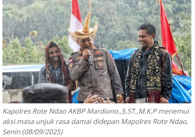 Kapolres Rote Ndao AKBP Mardiono, S.ST., M.K.P. menemui massa aksi unjuk rasa damai yang digelar di depan Mapolres Rote Ndao pada Senin, (08/9/2025)