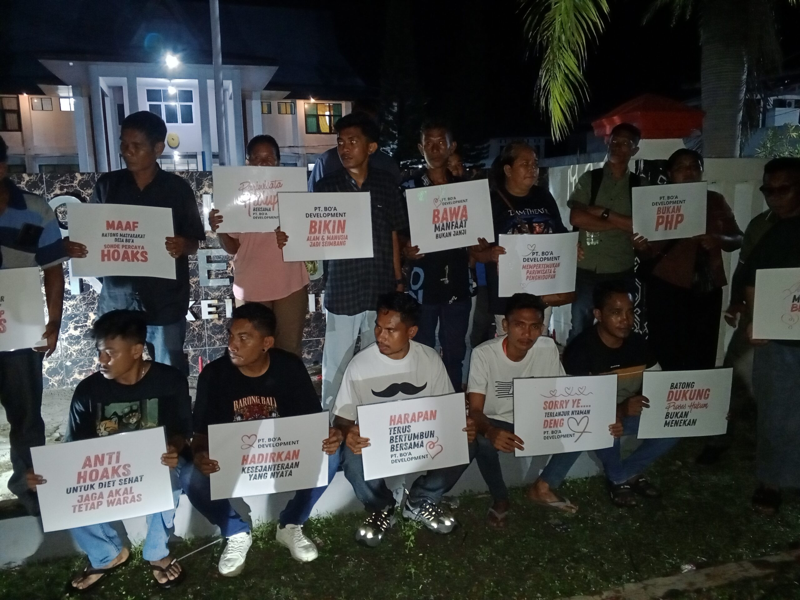 Hal ini terlihat dari poster bertuliskan “PT Bo’a Development Bawa Manfaat Bukan Janji,” “Hadirkan Kesejahteraan yang Nyata,” “Gerakkan Ekonomi Kami,” “Buka Ruang Generasi Rote Ndao,” serta “Maju Bersama PT Bo’a Development.”